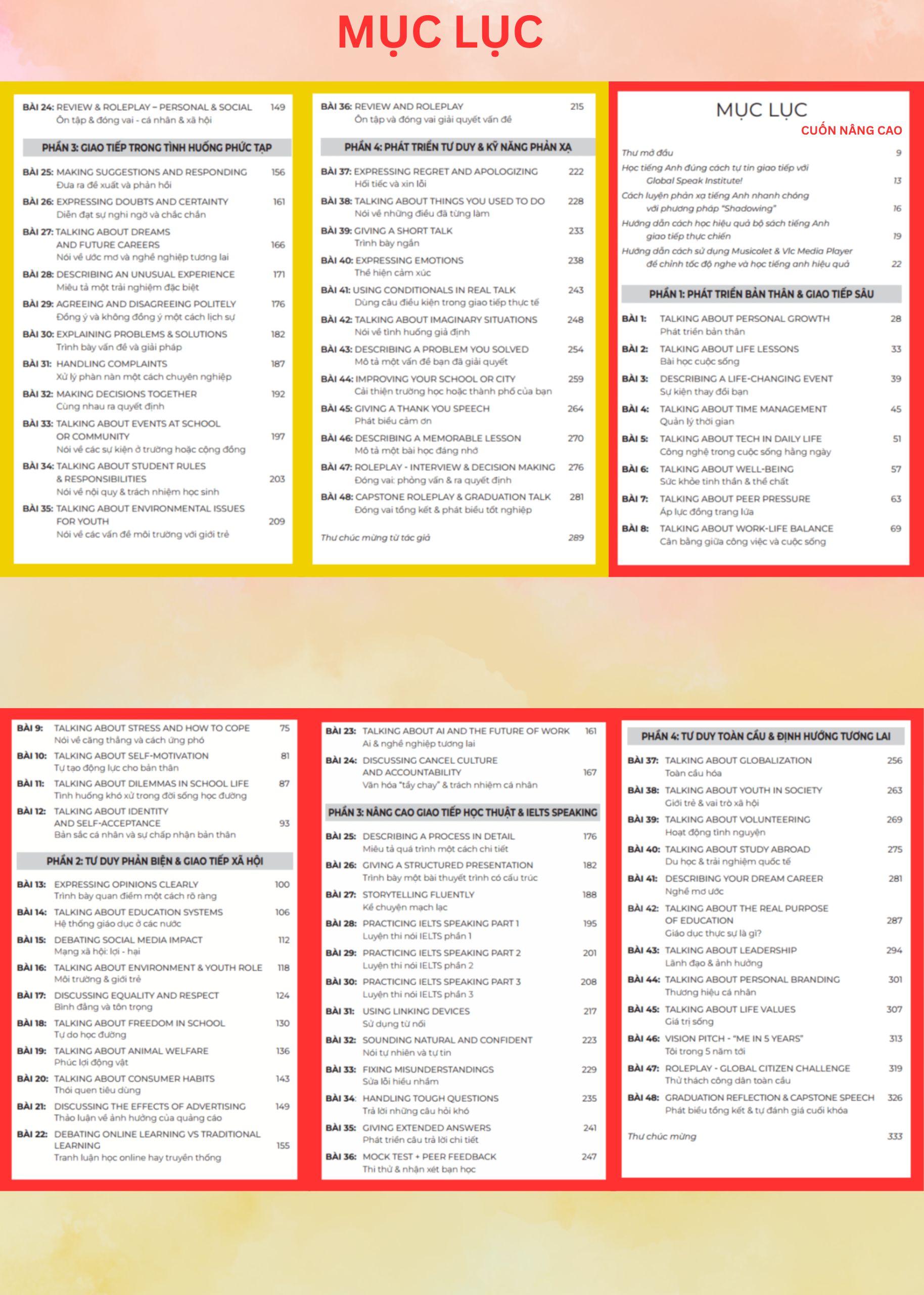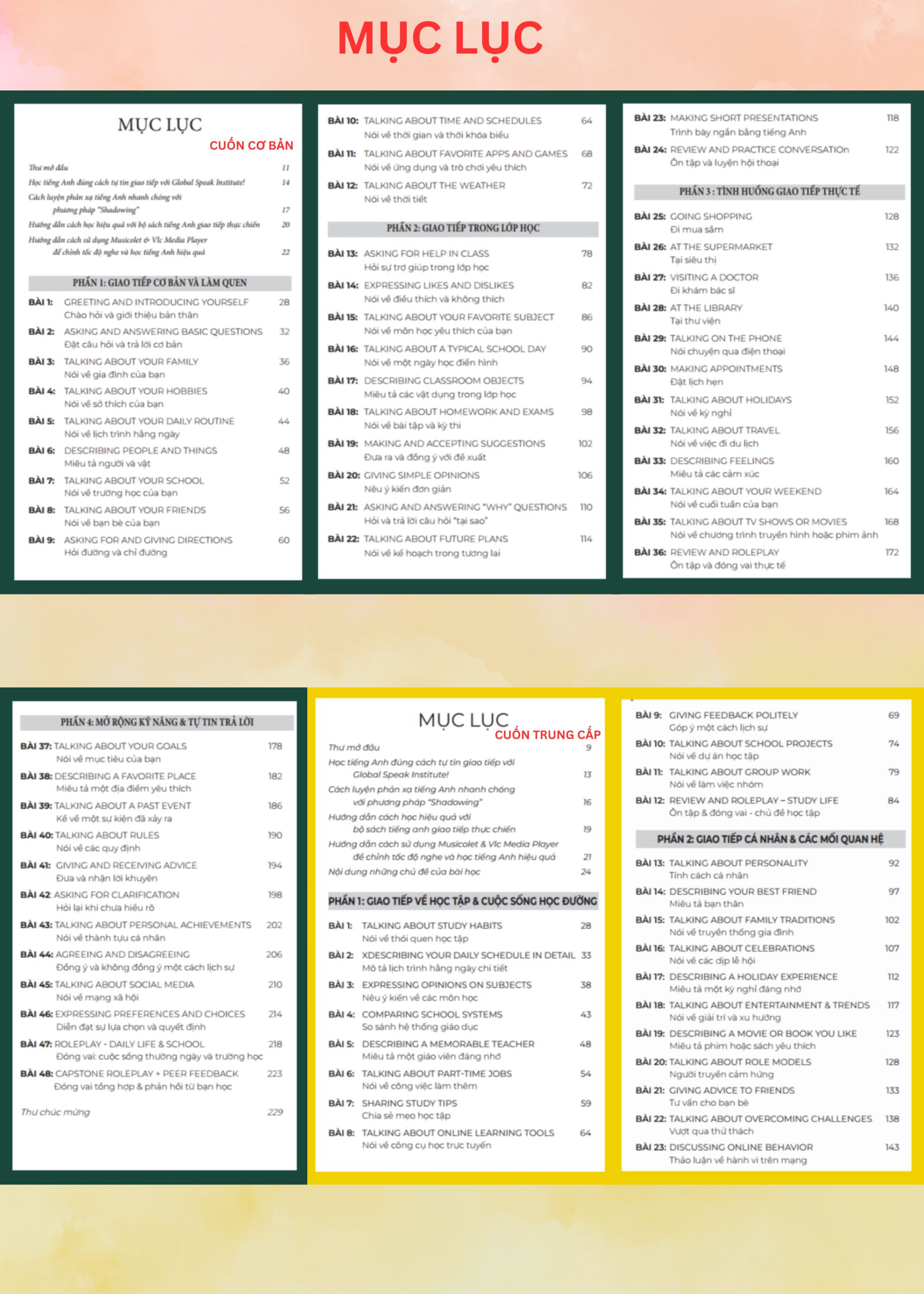 Mỗi cấp độ gồm 48 chủ đề thực tế, gắn liền với đời sống học đường và xã hội, giúp bạn vừa học vừa ứng dụng ngay.