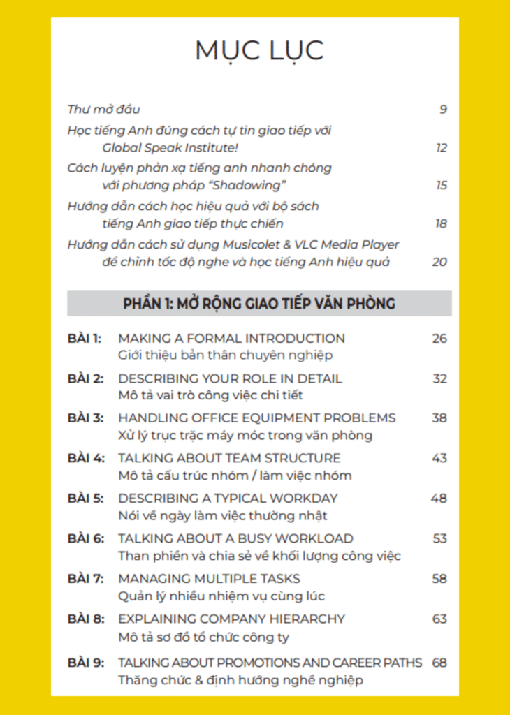 Phần 1: Mở rộng giao tiếp văn phòng – từ giới thiệu bản thân chuyên nghiệp, mô tả vai trò công việc, đến xử lý sự cố văn phòng và quản lý khối lượng công việc.